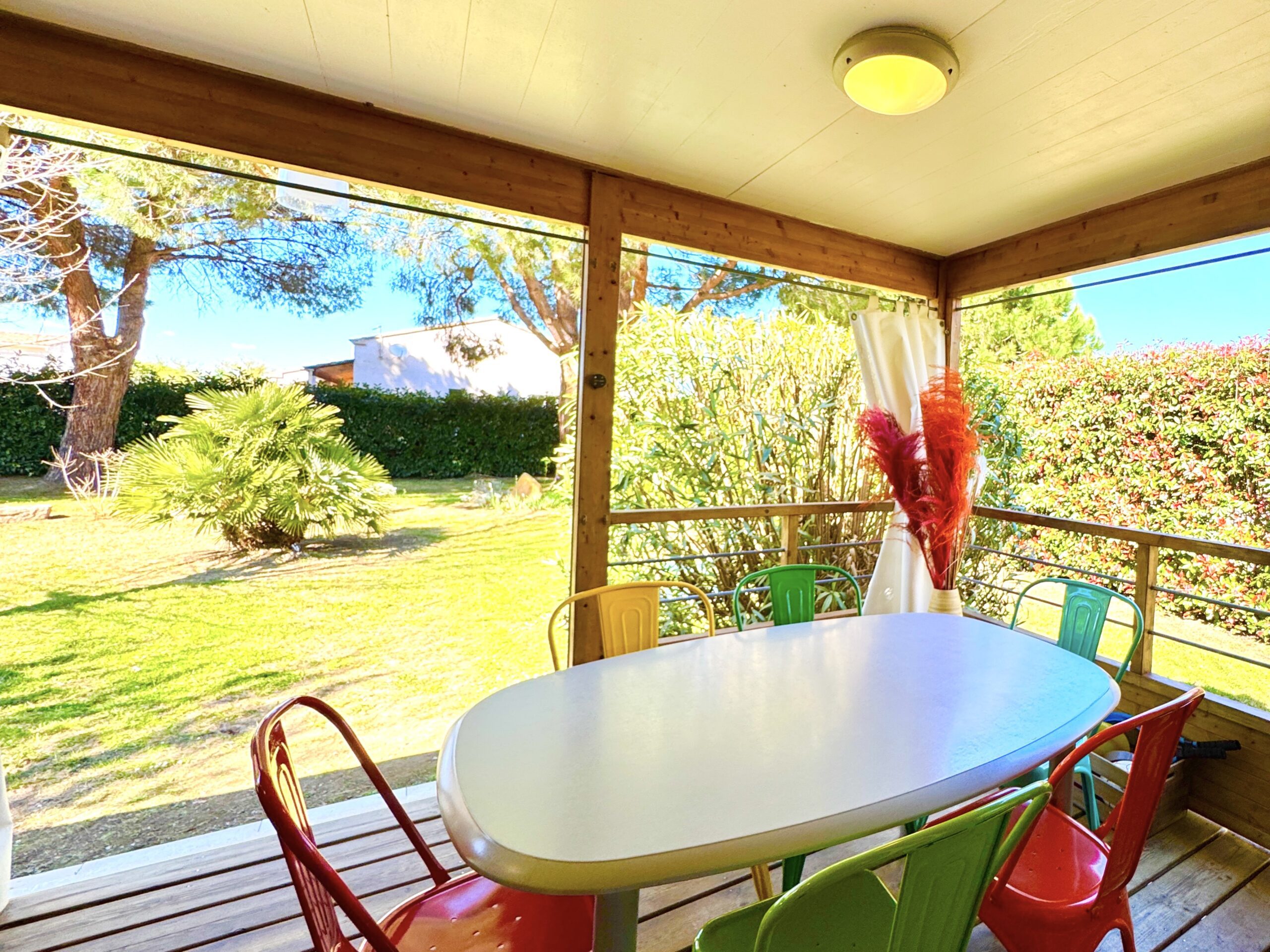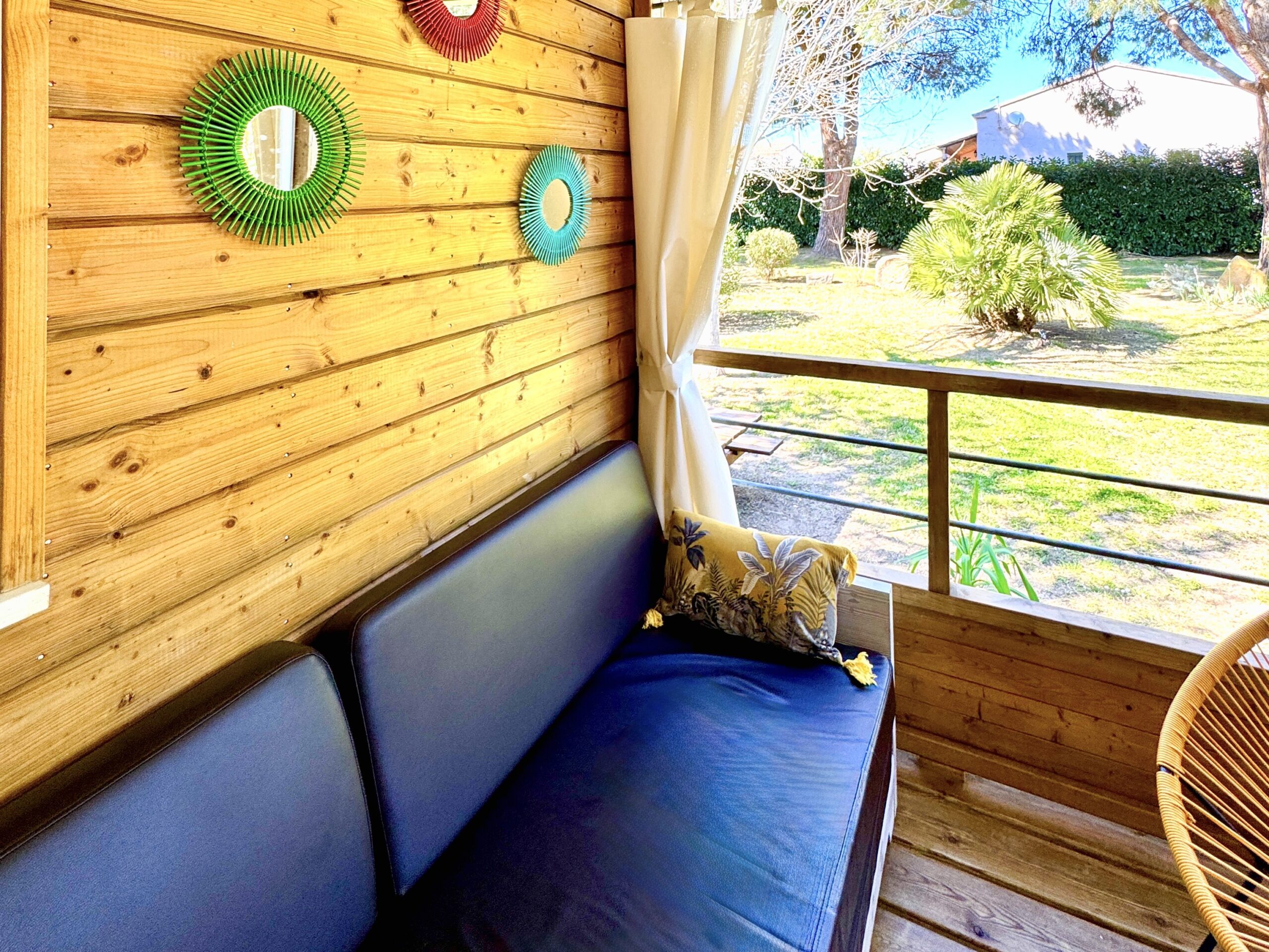 Ce chalet climatisé de 40 m2, décoré avec pour thème “la mer”, comprend entre autres : une terrasse couverte, 3 chambres (5 lits), une cuisine toute équipée et une salle de bain avec WC séparés.