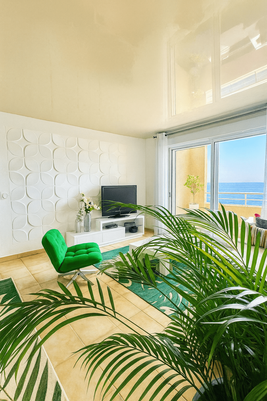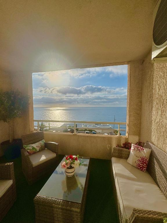 Très lumineux, avec 3 grandes baies vitrées donnant sur un grand balcon et terrasse face à la mer avec une vue imprenable sur les îles italiennes. Cuisine intégrée et toute équipée, 2 chambres (2 lits), salon spacieux avec divan convertible (2 places) et salle de bain avec WC séparés.